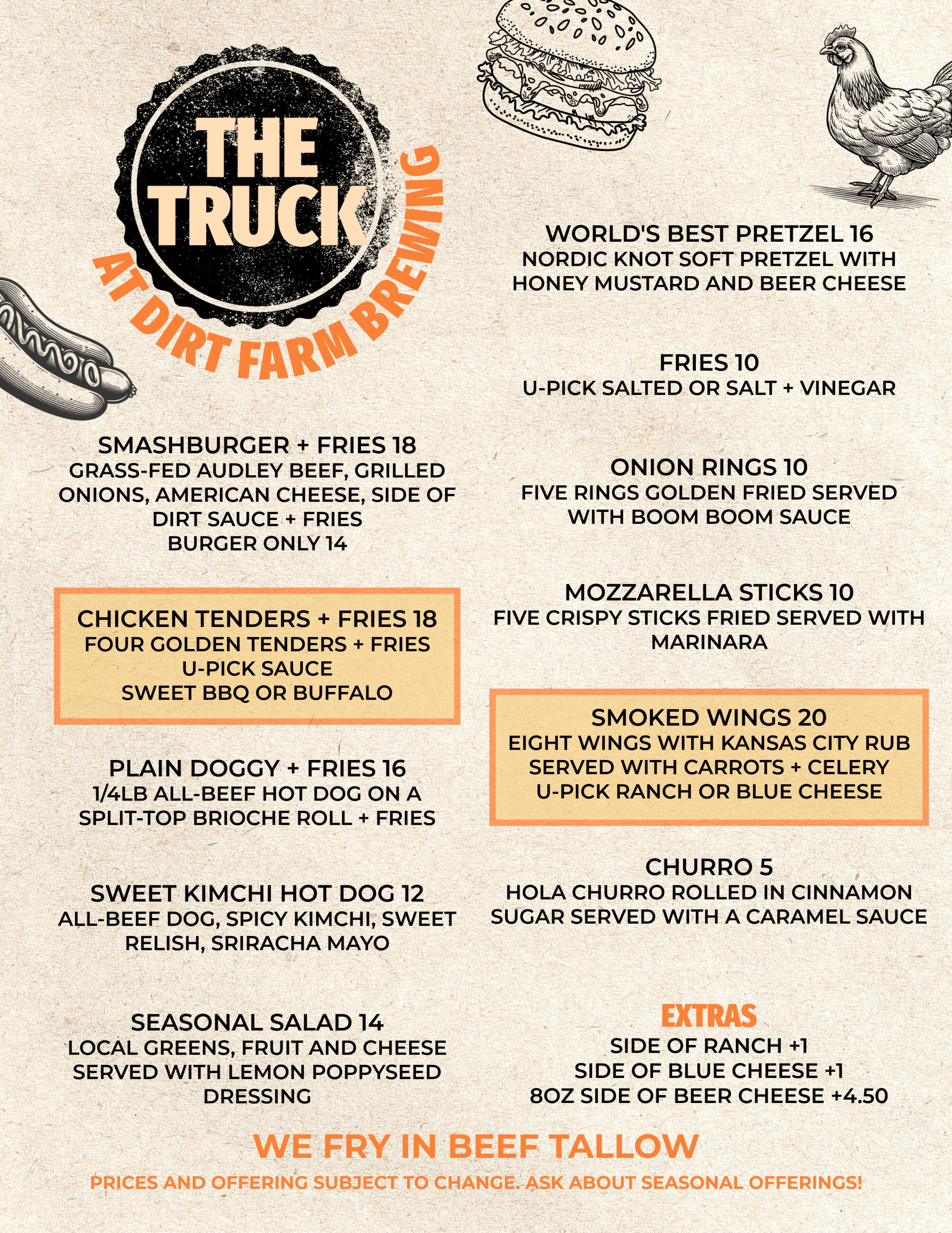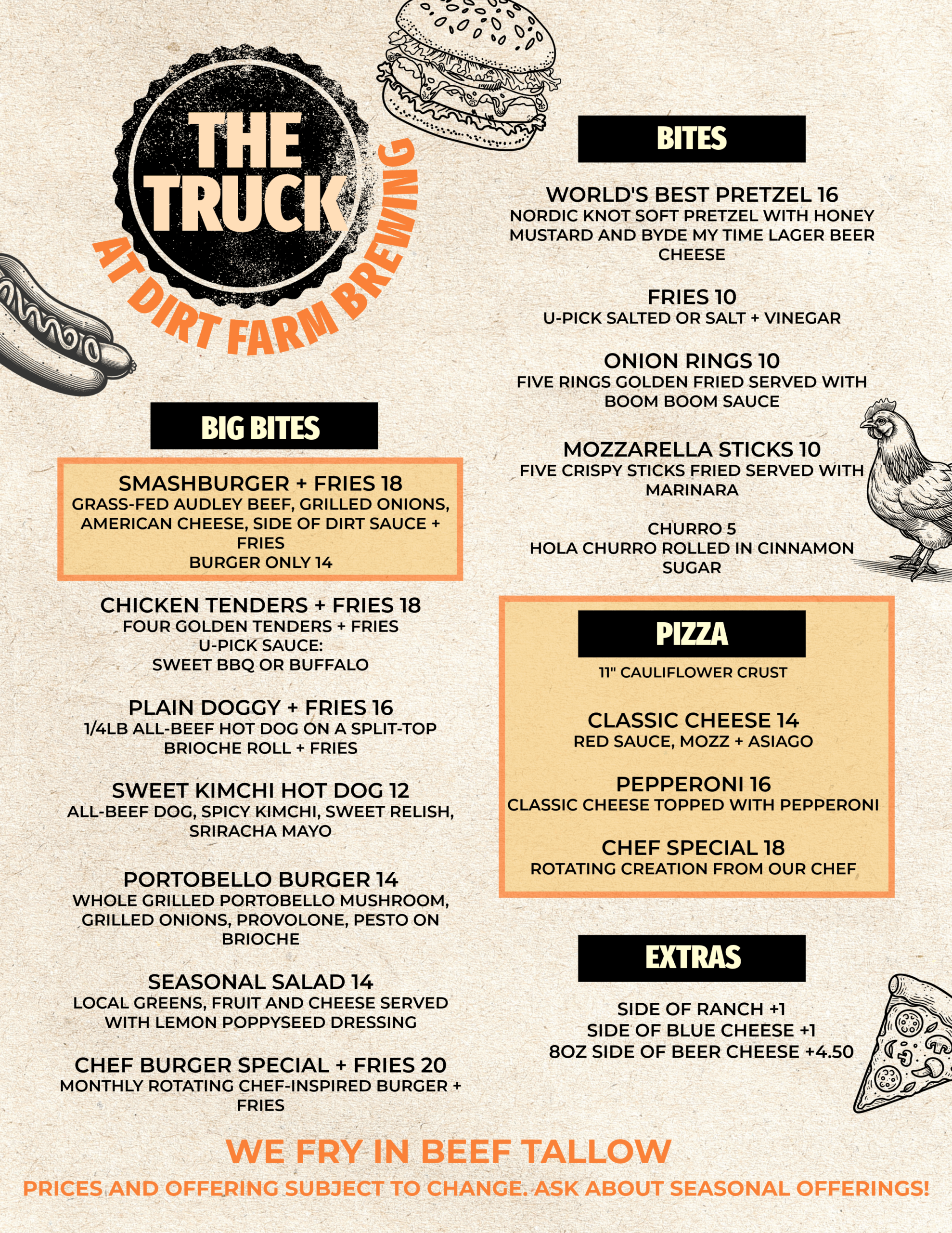 Open daily featuring a rotating seasonal menu pulling fresh ingredients from the farm. The Truck opens with The Taproom and closes 60 min prior to the Taproom closing. Check out The Truck Weekday Menu and Weekend Menu.